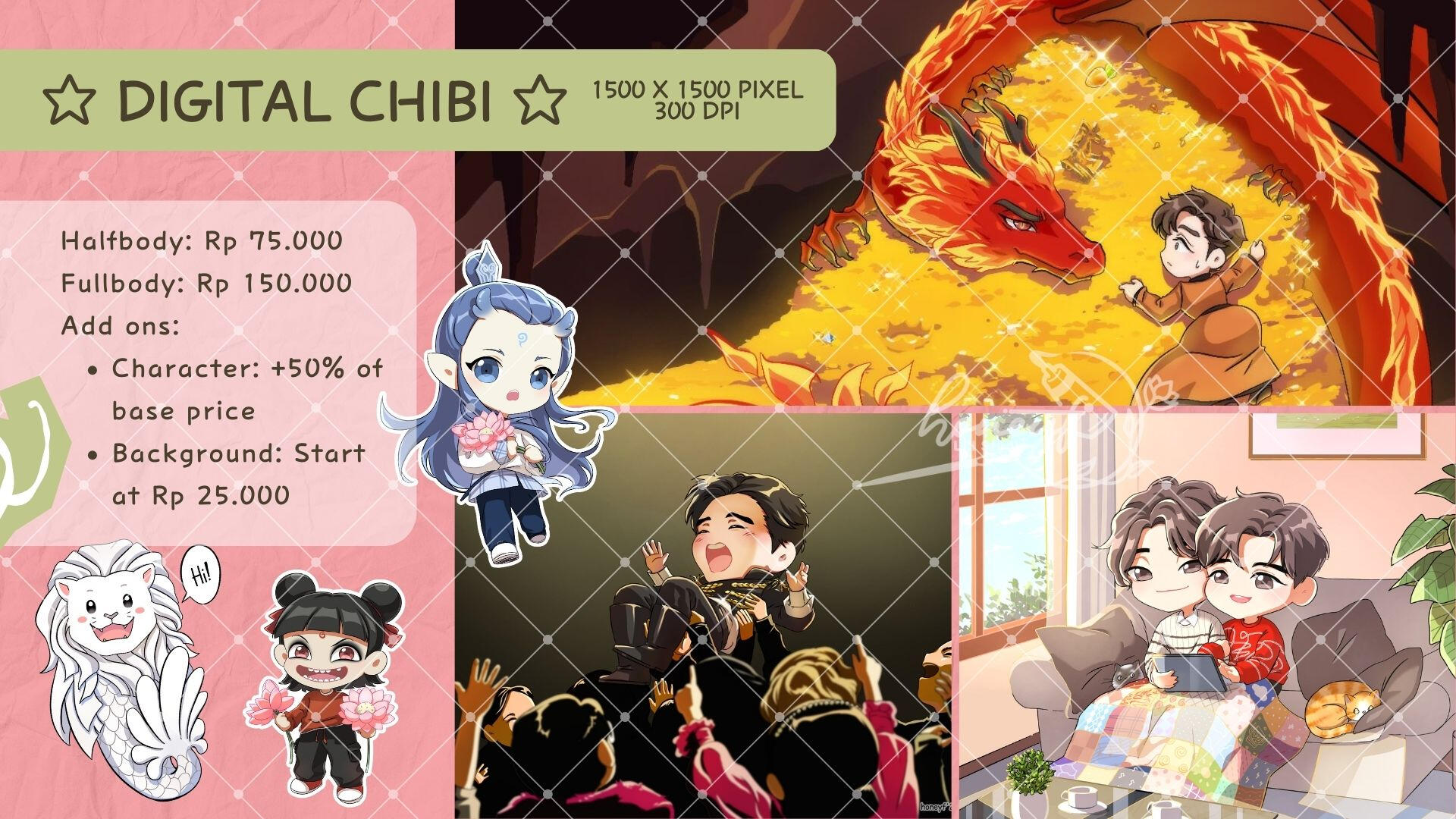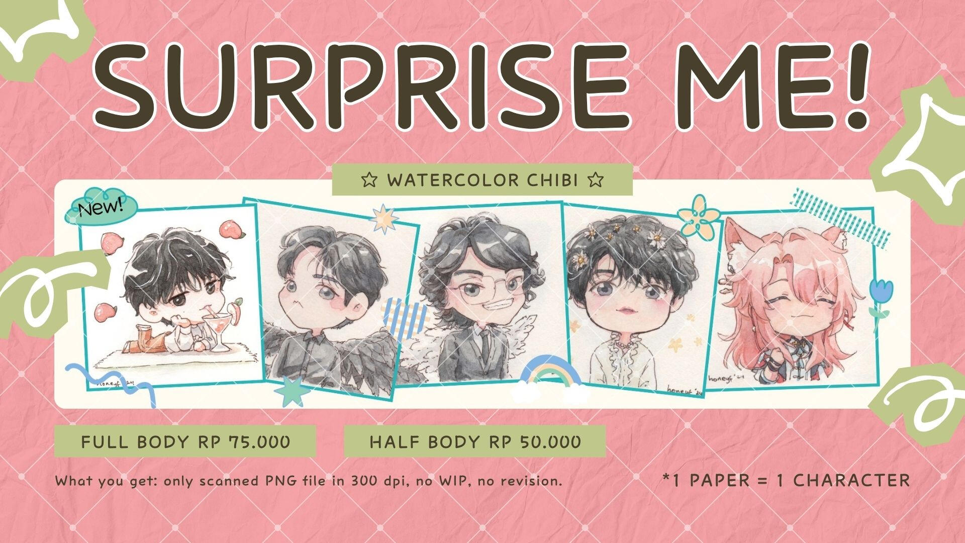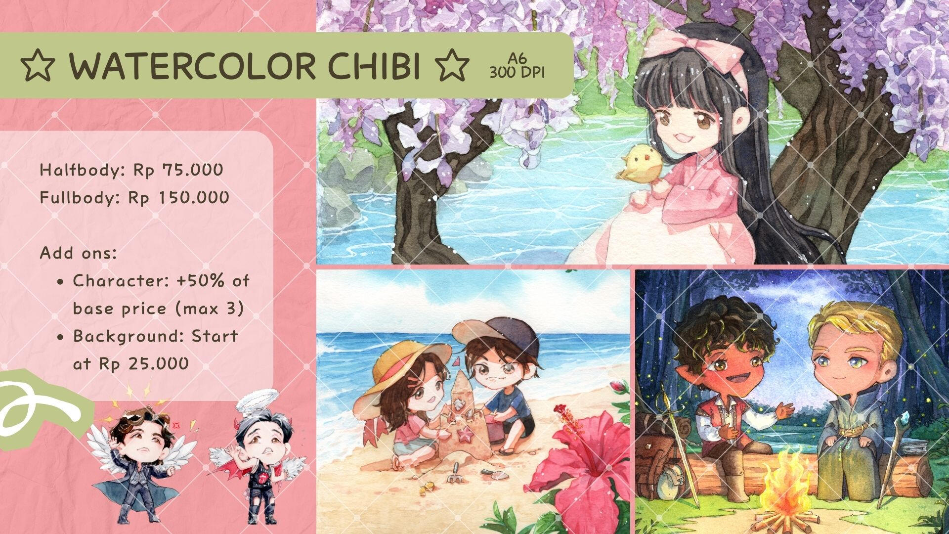 I'm Hanif, a freelance illustrator who adores drawing — particularly in watercolor and chibi styles. If you're interested in commissioning artwork from me, all the necessary information can be found on these pages.
