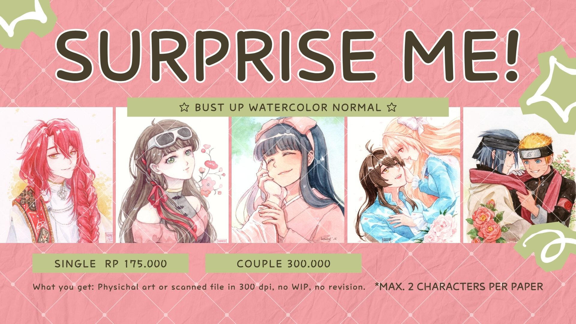 Finished art will be sent via e-mail. Format: PNG for Digital Art, Scanned Image for Watercolor Art.